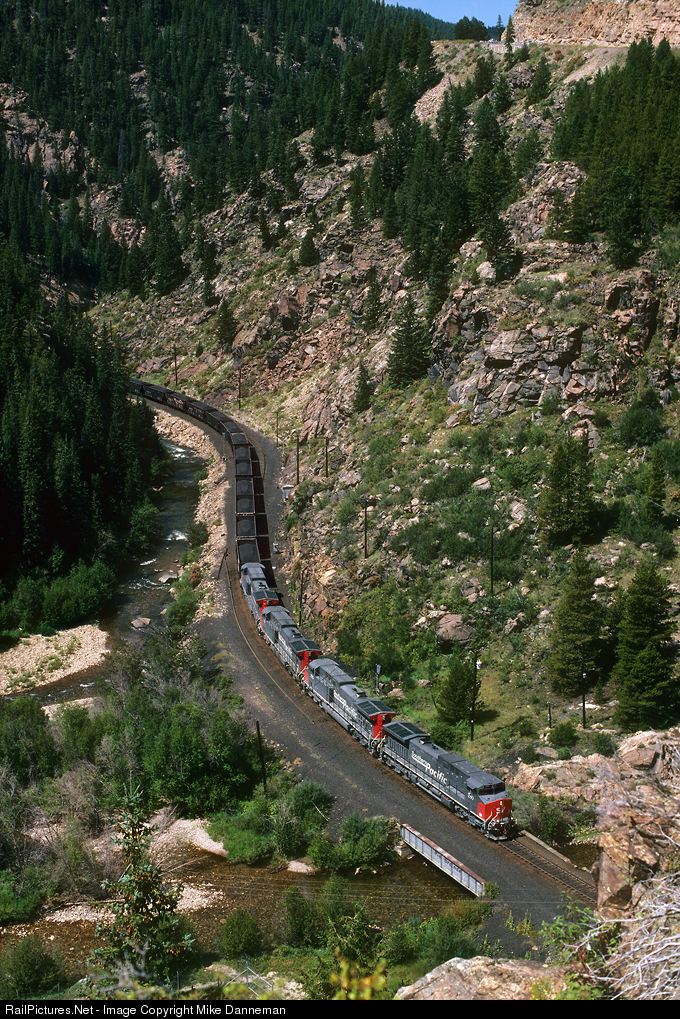 A Southern Pacific coal train grinds up the steep 3% grade of Tennessee Pass in the Eagle River Canyon at East Belden, Colorado, on September 5, 1995. On the point of this 105-car unit train are four new SP AC4400CWs, with two manned helper sets cut into the train further back, each with another trio of AC4400CWs. Ten AC4400CWs grind up the grade—that’s 44,000 horsepower!