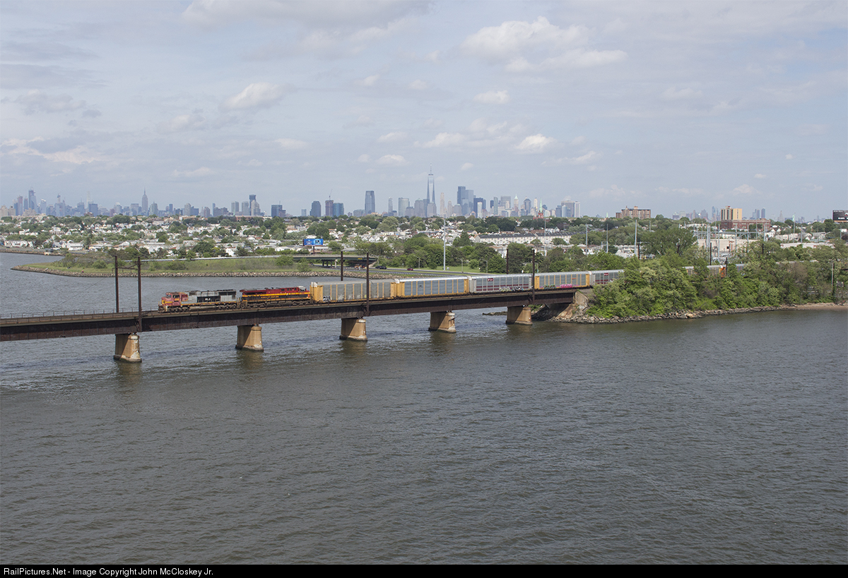 PRLX #212 formerly BNSF & ATSF #212 is seen leading loaded auto rack train X23419 across the Upper Bay Bridge into Oak Island. The New York City skyline can be seen in the background with the World Trade Center being front and center.
