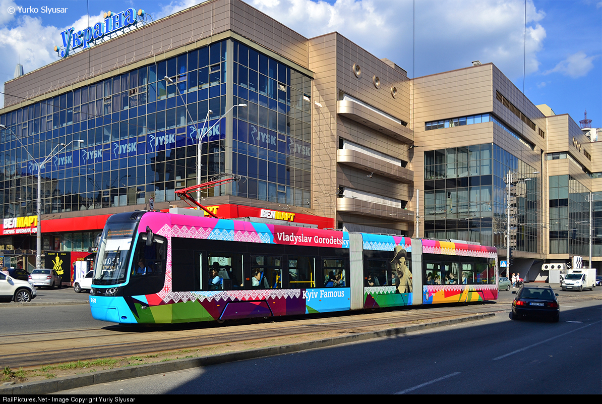 | The tramway PESA 71-414K "Foxtrot" #768 leading on route #1 Starovokzal'na street - Mykailivs'ka Borshyagivka through Zhylyans'ka street. This tramway built by PESA (Pojazdy Szynowe Pesa Bydgoszcz SA) in 2017. Onon the tram is depicted a famous Kyiv architect Vladyslav Gorodetsky which designed many houses in historic part of Kyiv. |