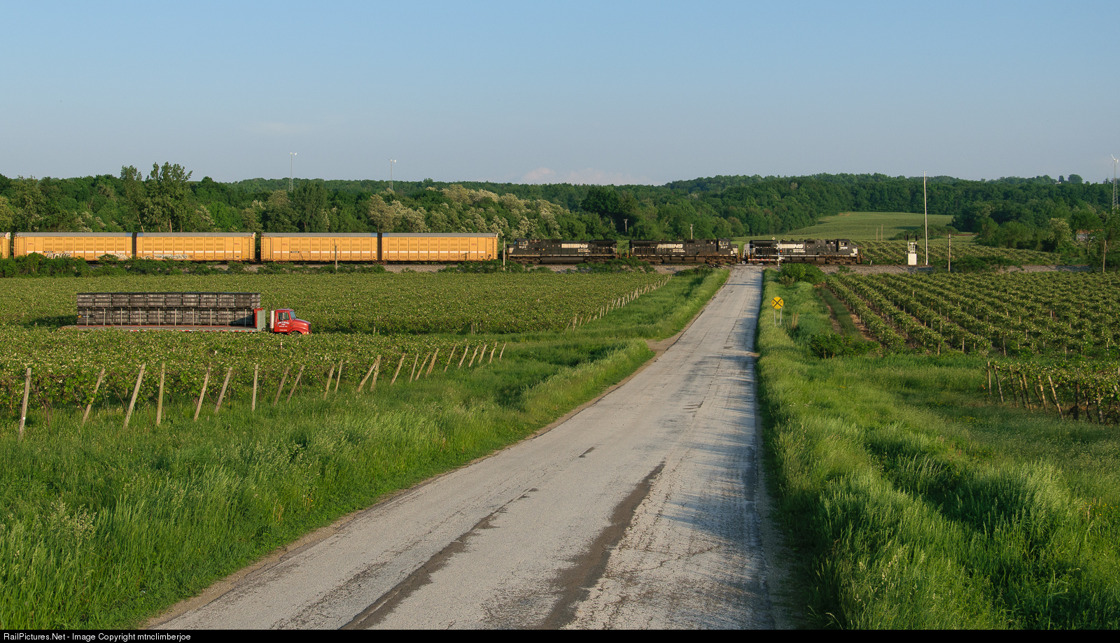 Westbound NS auto train 287 passes through fields of grapes in the rural vineyards along Lake Erie. The train is about to exit New York State and continue west into Pennsylvania.