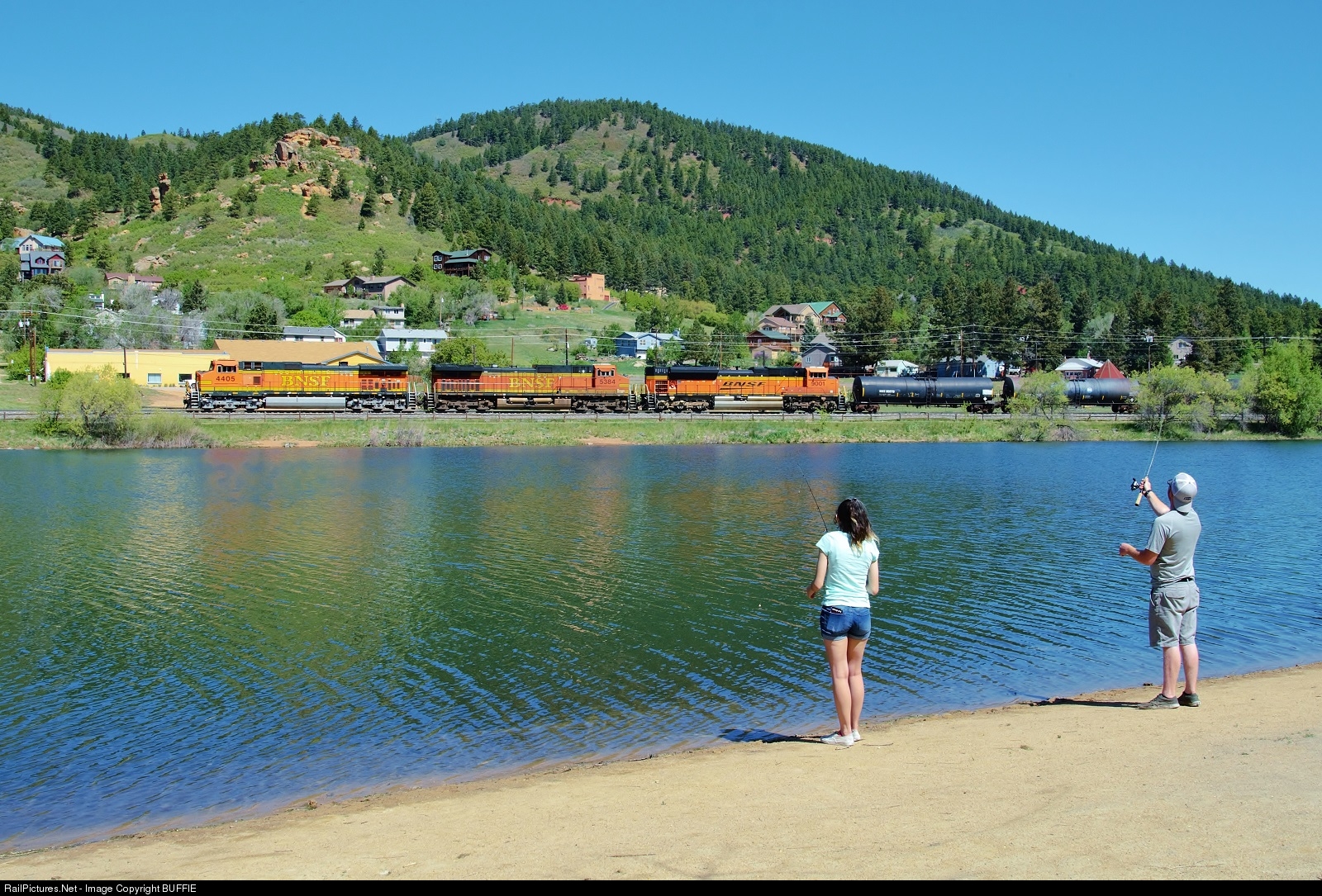 | The final stop on our chase of BNSF 4405 and its freight was Palmer Lake, Colorado. Palmer Lake is at elevation 7,250 feet and is at the top of the Palmer Divide which is separates the Denver metropolitan area from the Pike’s Peak / Colorado Springs area. The lake was historically used to replenish water for steam locomotives traveling to and from Denver from Colorado Springs but is now a popular fishing spot. |