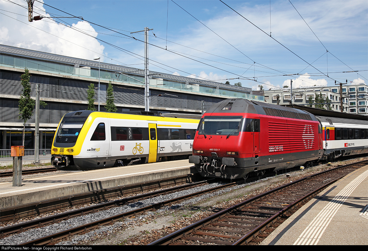 | German VT 612 025 is on the way Basel - Thayngen, Re 460 022 heads Intercity from Schaffhausen to Zürich. |