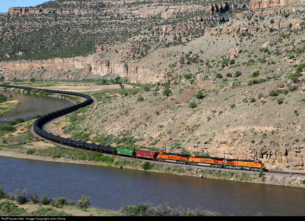 An unusual BNSF Eastbound empty Oil train is using Union Pacific trackage rights and is seen following along the Colorado River at the East switch at Tunnel siding in De Beque Canyon.