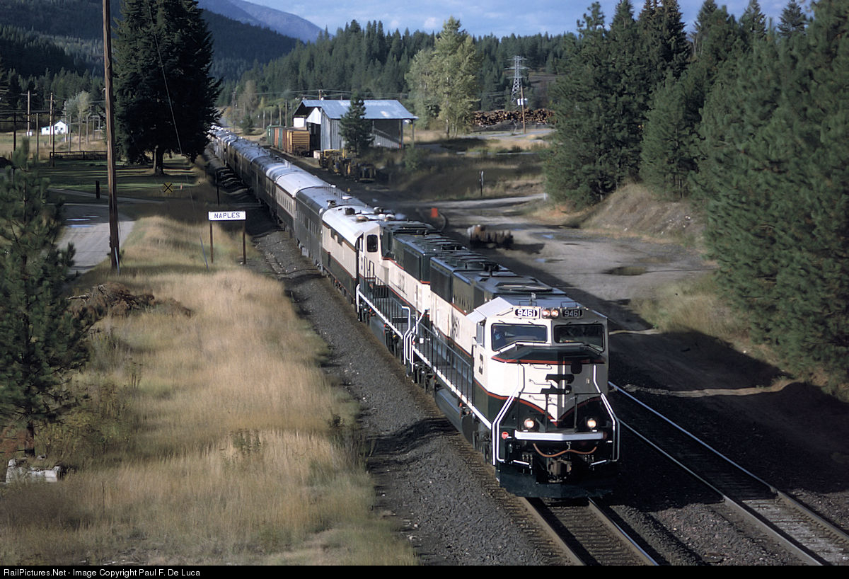 A westbound BN business car train is seen off of the old highway 95 overpass at Naples, ID.