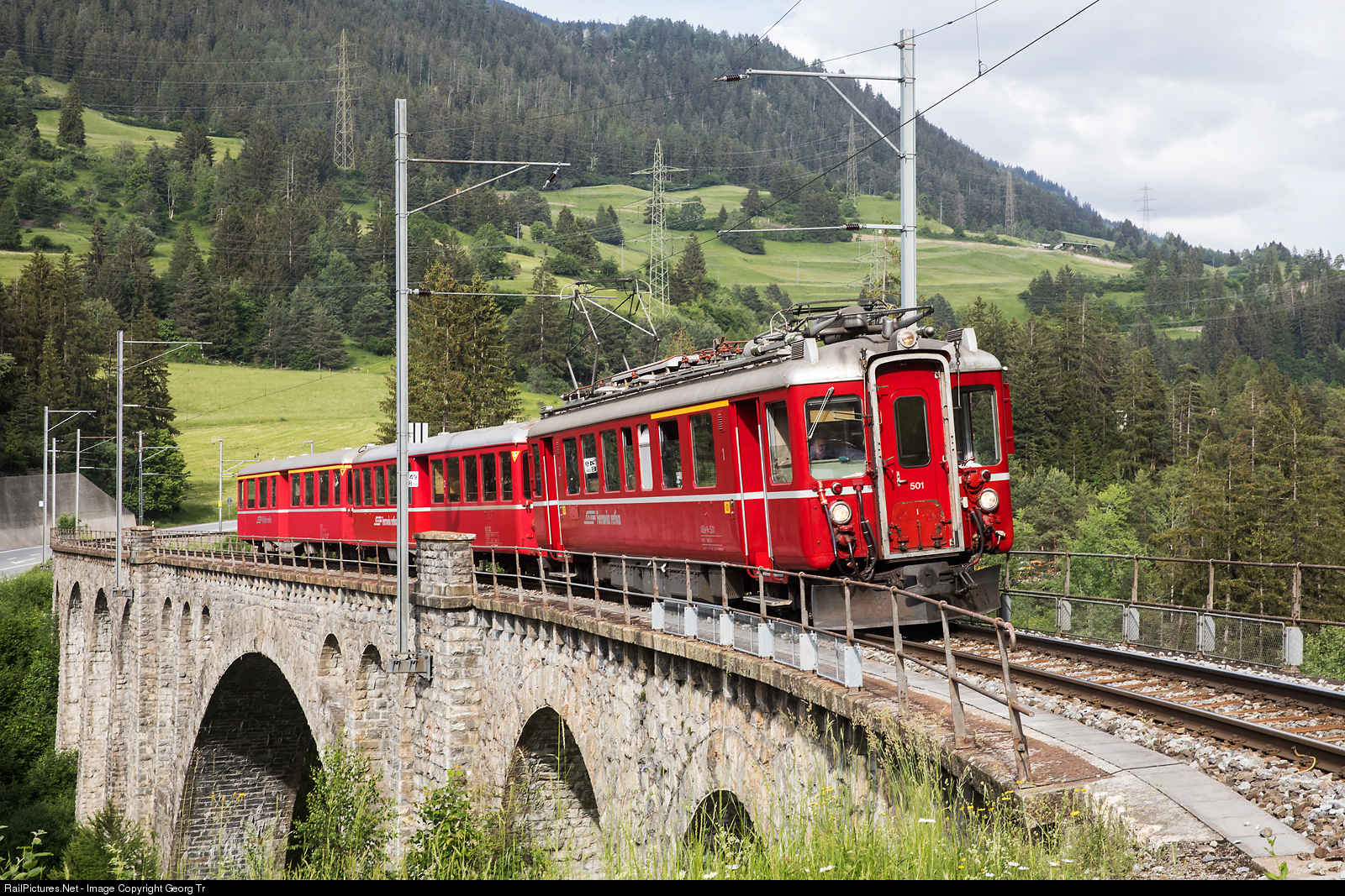 "Flying Rhaetian" ("Fliegender Rhätier") express train from 1939, with electric railcar ABe 4/4 (when built BCe 4/4) # 501 (SWS/MFO/BBC) and leightweight cars second class B # 2302 and first class A # 1251, on the 85 meter high and 164 meter long Solis viaduct (main span 42 meter, built in 1902). This was a privately organised RM photo charter.