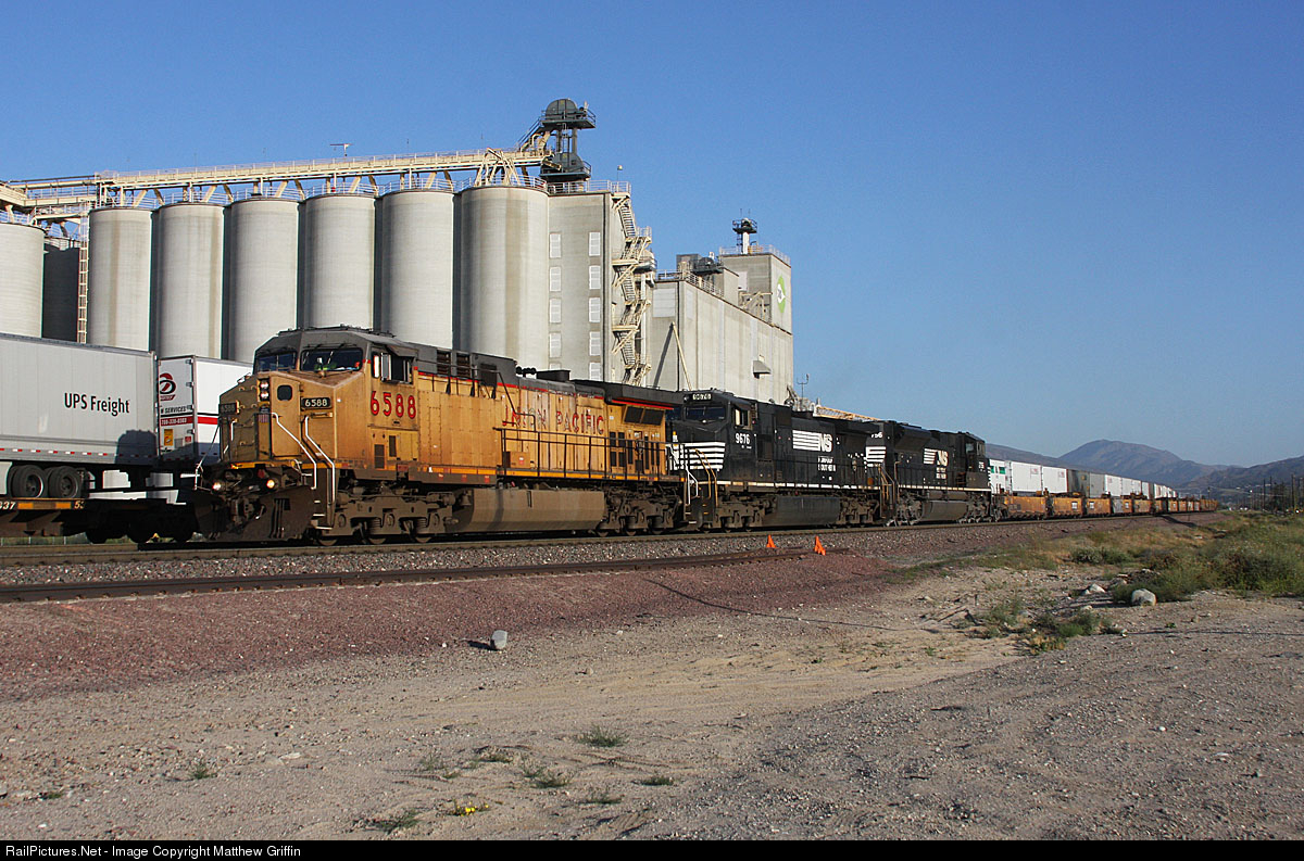 UP 6588 along with two NS units, lead a westbound past the Cargill grain mill at Verdemont.