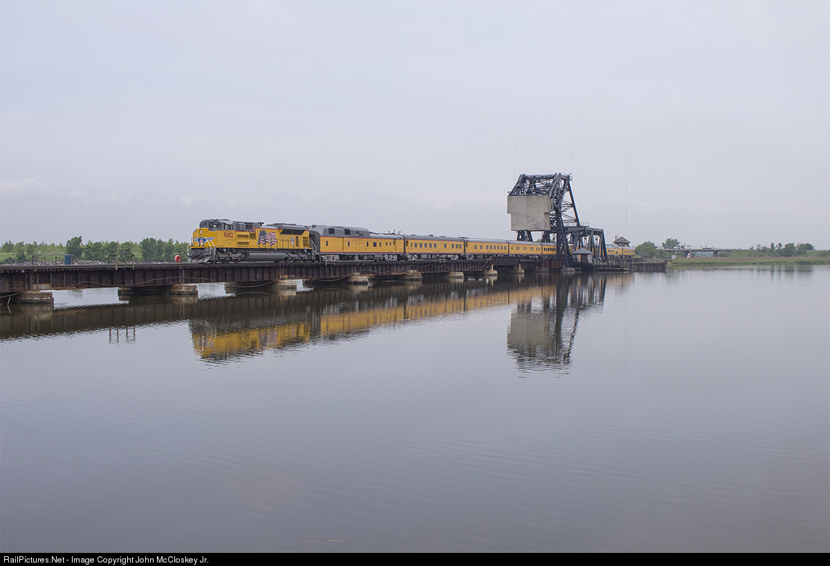 The NS H81 local crew is seen in charge of UP #9082 and 9 Union Pacific passengers after wyeing the train on the Meadowlands Wye. H81 is seen returning to Croxton over Hackensack River via the HX Bridge. Still odd to see a UP engine leading over NJ Transit..