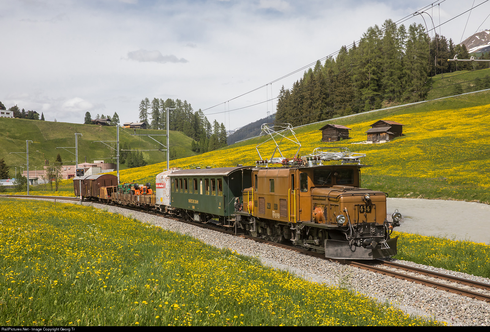 The "C-C" or "Rhaetian Crocodile" Ge 6/6 I # 414, built in 1929 by SLM, BBC and MFO, is pulling a mixed passenger/freight train from Davos to Filisur, between Davos Frauenkirch and Davos Wiesen. The consist: second class passenger B # 2245 from 1928, "Mohrenkopf" Xc # 93121 from 1959 (former Uc 8017) for pulverized cement, flat car Kk-w, 4 axle flat car Re-w # 8244 from 1966, loaded with a Bührer (1961) and a Merk-Pullax (1965) tractor, Xc ballast car, two covered freight Xk former Gb. A privately organised RM photo charter.