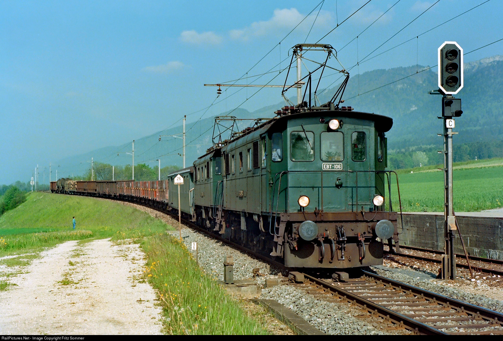 | On 22 May 1991, two Be 4/4 locomotives in multiple control with the leading # 106 (built in 1931) just reaches with freight train # 904 Lommiswil station on the SMB (Solothurn-Münster-Bahn).