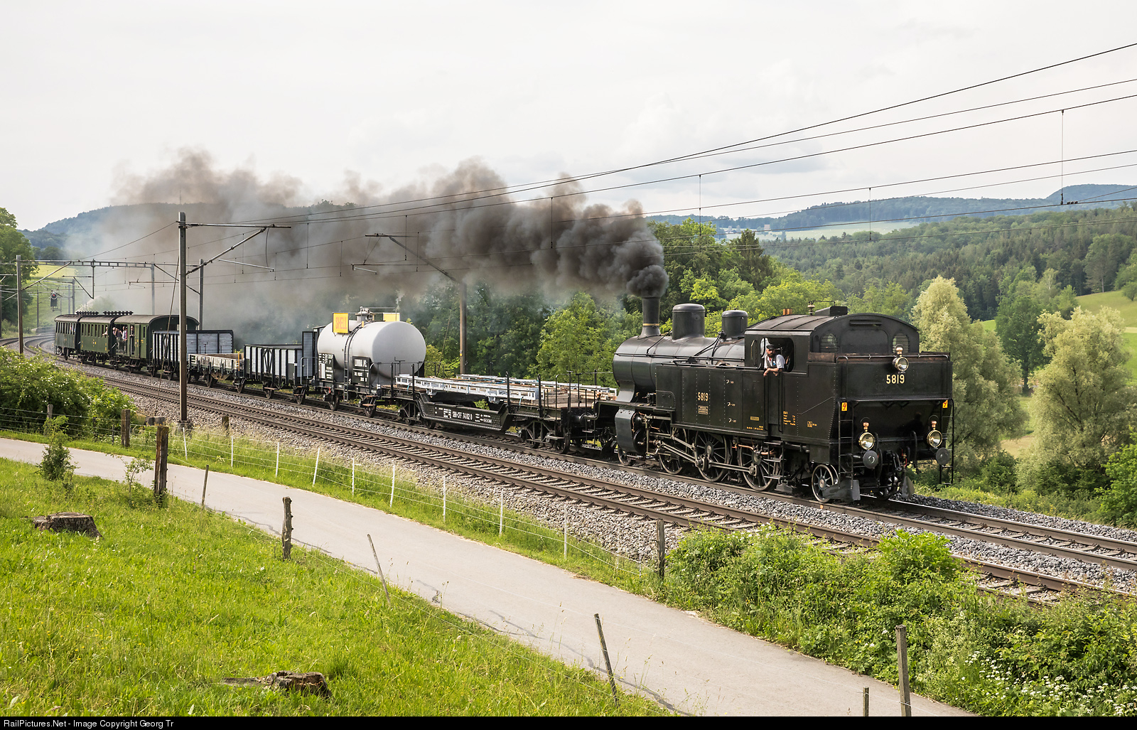 | 2-6-2 "Habersack" Eb 3/5 # 5819 of SBB Historic is pulling a beautiful contemporary mixed passenger/freight train over the Bözberg line from Frick to Brugg (AG), on the occasion of the open doors days 2018 in the Bahnpark Brugg (AG). All of the cars are from association Dampfbahn Verein Zürcher Oberland (DVZO). |