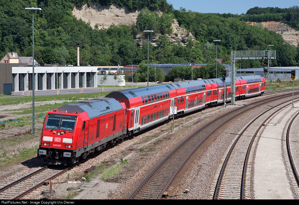 | The diesellocomotive 245 037, built May 2017 by Bombardier, is pulling train RE 4211 from Ulm to Lindau. |