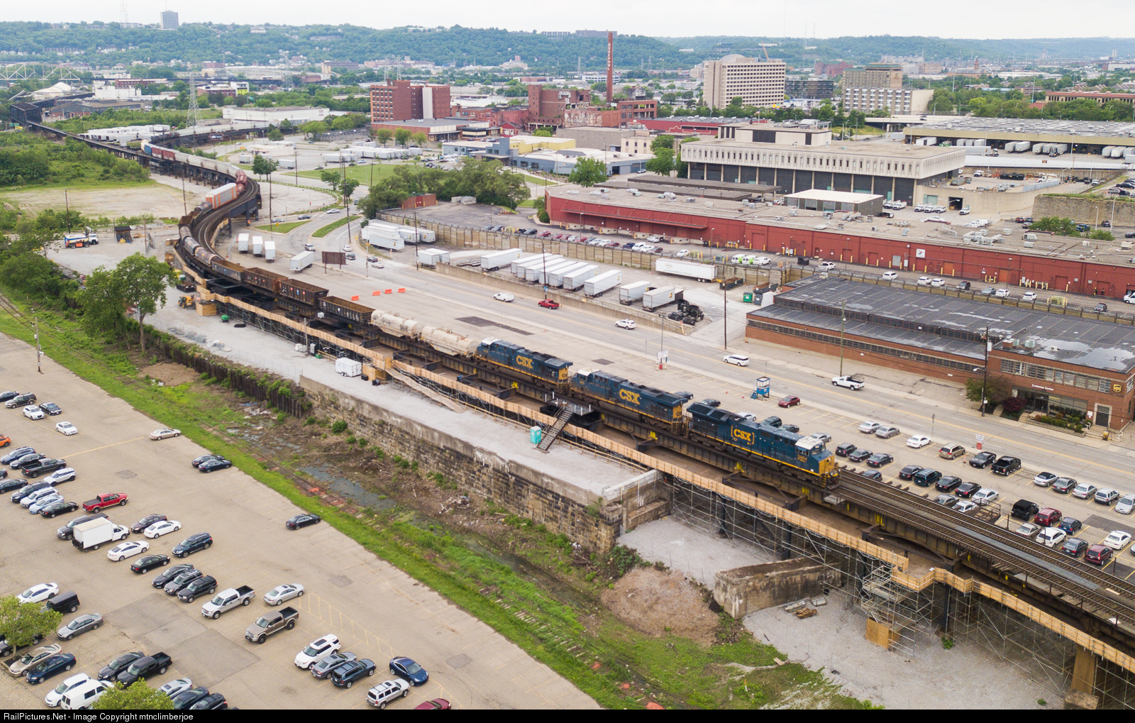 CSX manifest freight Q573 snakes over elevated trestles through Cincinnati as it heads towards the bridge to cross the Ohio River and head south.