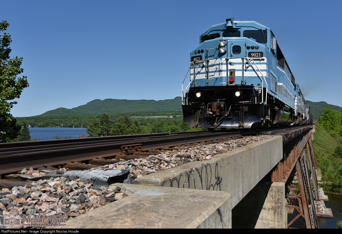 With a trio of Blue Barns leading and a CMQ GP38-3M fourth, CMQ #1 rumbles across the bridge at Eastman on a sunny afternoon. You can also see a part of Mount Orford in background.