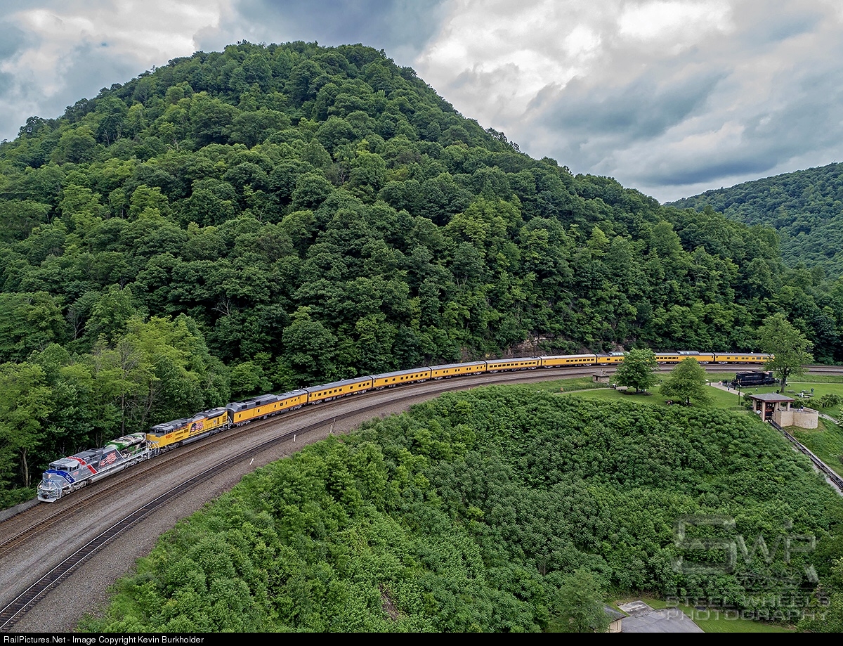 | Following a successful event for the Union Pacific executives and some shareholders, the train is now enroute back to the Union Pacific and is rounding the NS Horseshoe Curve west of Altoona, PA and passing the stuffed and mounted Pennsylvania Railroad GP9 on display. |