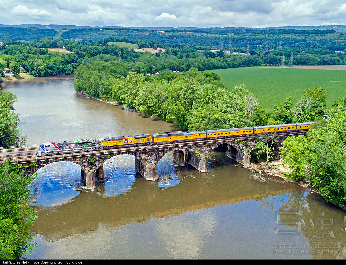 Union Pacific's office car special is seen heading across the Juniata River south of Lewistown, Pennsylvania, on the Norfolk Southern Pittsburgh Line, where non-NS cab signal leaders are a rarity. UP had equipped SD70AH 1943 with the NS cab signals to lead over this particular piece of railroad and to specifically to lead over Horseshoe Curve and Rockville Bridge. UP 1943 and 9082 are making time as they head west on the return trip to Chicago and ultimately Council Bluffs, IA.