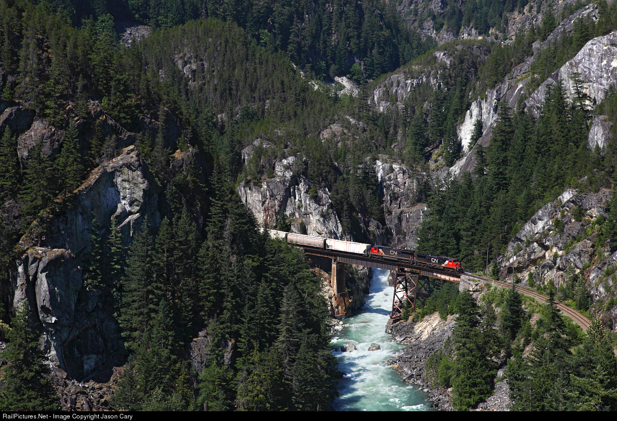 Cheakamus Canyon in my opinion is one of the most spectacular railroad locations in Canada. The railroad drops on a steep 2.2% grade along side of the raging Cheakamus River cutting a narrow defile thru the Coast Mountains. The spectacular route was built by the Pacific Great Eastern Railway, and is now operated by the Canadian National.