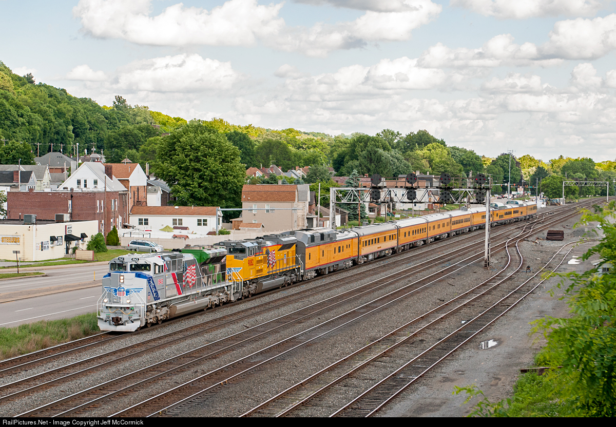 | UP's "Spirit of the Union Pacific" Office Car Special passes the soon to be removed PRR signal bridges at CP Leets as it heads west toward Chicago after spending the weekend in New York and New Jersey. It was a treat to see this train in western Pennsylvania for sure! |