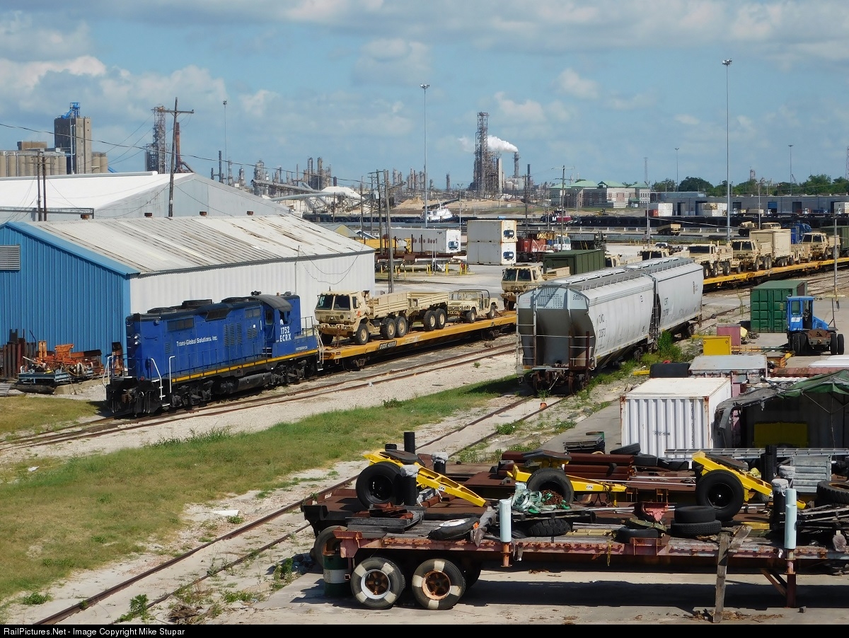 Trans-Global Solution's ECRX 1752 switches out flatcars of military vehicles in the Port of Beaumont on a warm afternoon in May.