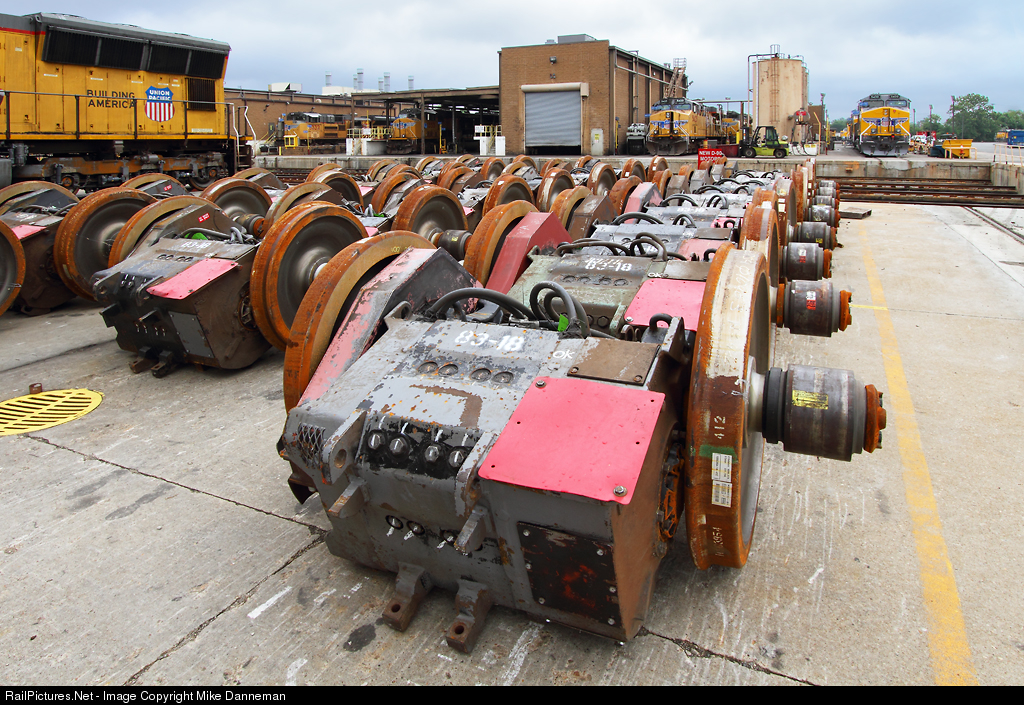 Rebuilt traction motors, along with new wheels and bearings, wait to be installed in overhauled locomotives at the railroad’s Downing B. Jenks Shop in North Little Rock, Arkansas, on May 18, 2015. Several locomotives, either awaiting work or recently completed, rest along the transfer table outside the main shop building.