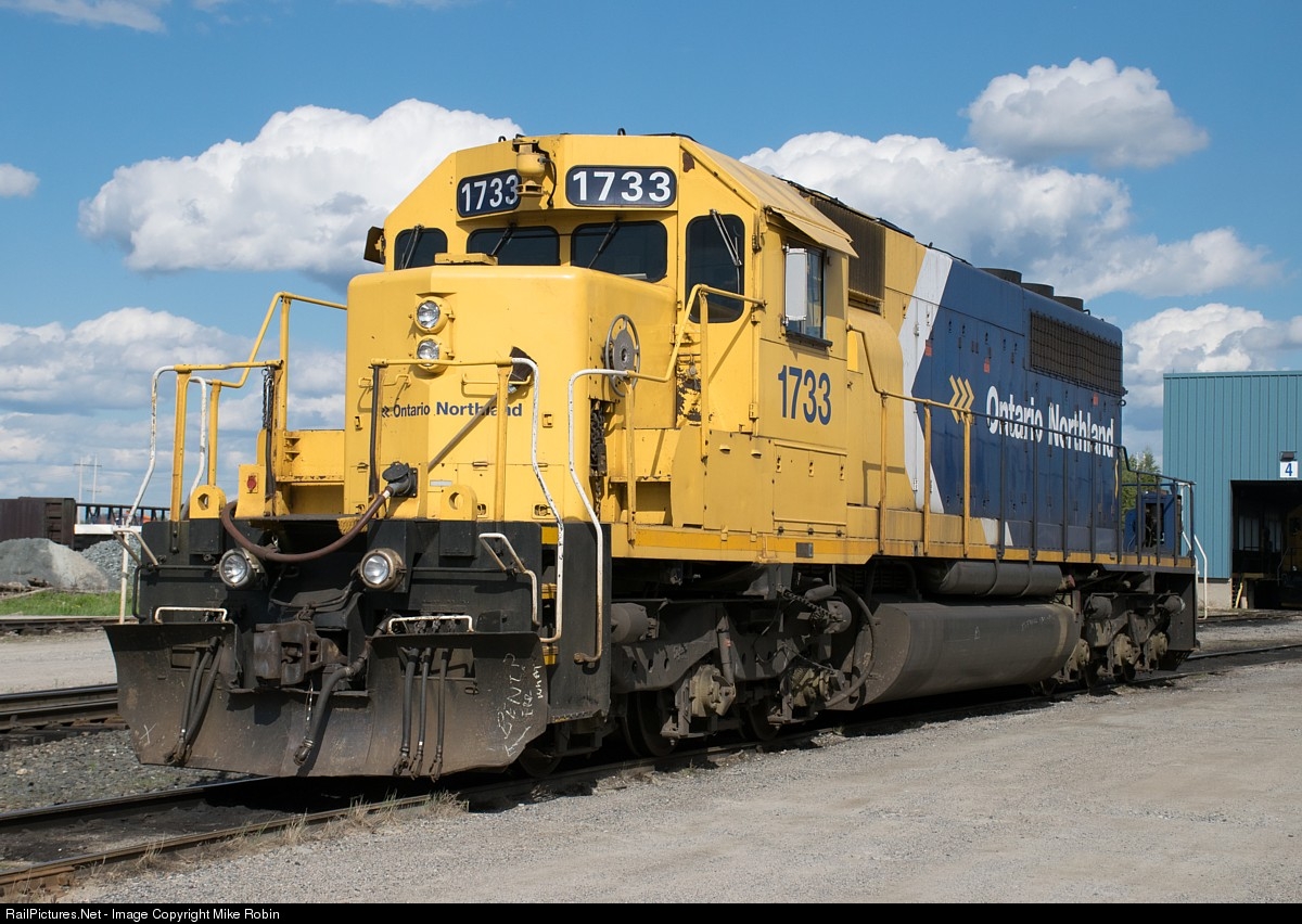 | SD40-2 1733, the 2nd Ontario Northland locomotive to receive the railway's "Arrow" paint scheme is captured on 3 track at Cochrane Shops June 8, 2018. |
