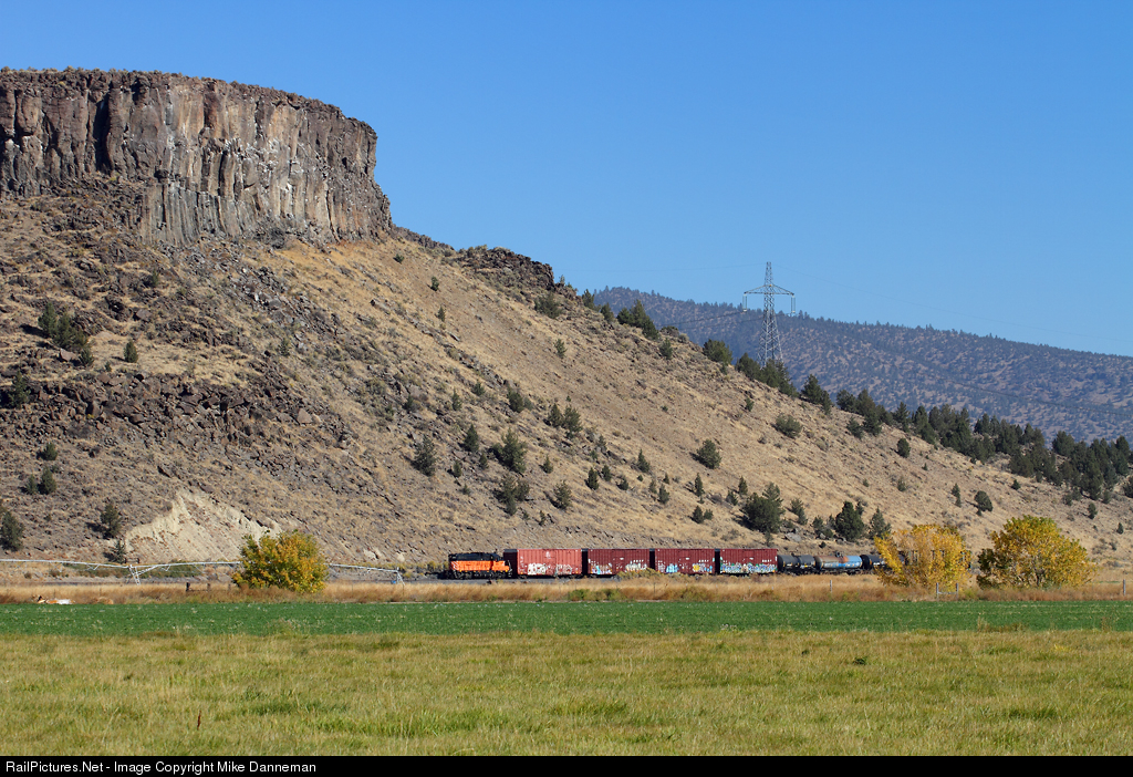 A westbound City of Prineville Railway freight follows the Crooked River along the cliffs lining Prineville Valley just west of Prineville, Oregon, on September 28, 2016. From this distance, the locomotive looks “Milwaukee Road,” and it’s no accident—COPR No. 989 is one of the Milwaukee’s unique GP9 rebuilds labeled a GP20 of the same road number and is painted in a very similar black over orange scheme. The train is headed to the BNSF interchange at Prineville Junction.