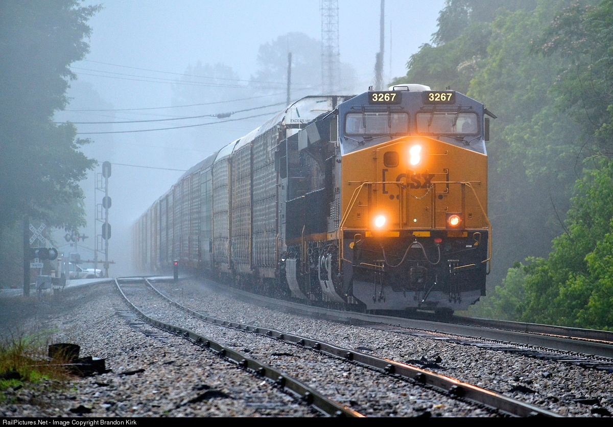 | Todays daily operated train CSX Q238, has a rather wet excursion to Talladega, AL. The dense fog is beginning to dissipate as Tier 4 power brings autoracks north through Roanoke. Packing some high tractive effort and sand if needed, CSXT #3267 keeps traction even though rain decreases the friction between its wheels and the rail. |