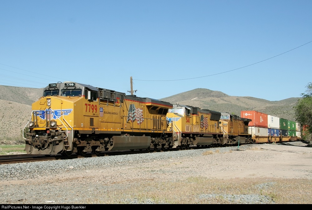 | Northbound Intermodal train with UP 7799 (ES44AC), UP 5140 (SD70M) and UP 6550 (AC44CW) at the front, and UP 8821 (SD70ACe) as DPU at the rear. |