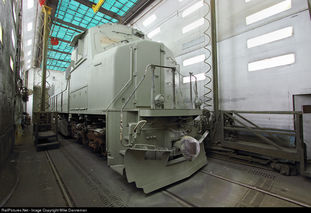 Union Pacific EMD SD70M No. 4609 has been sprayed with a coat of gray primer and dries in one of the paint shop bays at UP’s Downing B. Jenks Shop at North Little Rock, Arkansas, on May 19, 2015.
