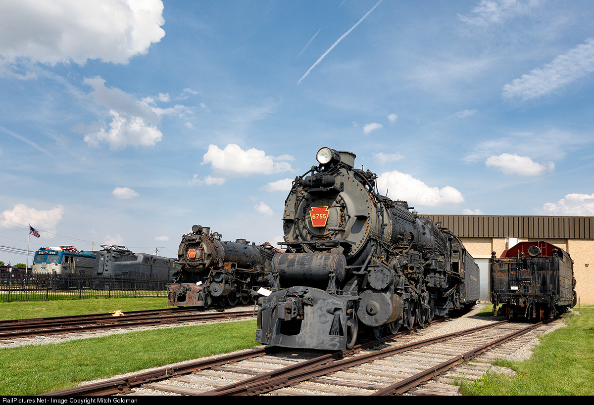 A line up of the Railroad Museum of Pennsylvania's outdoor locomotives featuring from right to left; PRR 2-8-0 No. 7688 (tender first), PRR 4-8-2 No. 6755, PRR 4-6-2 No. 3750, and in the front yard, PRR GG1 No. 4800 "Old Rivets", and finally, an Amtrak AEM-7 - No. 915.