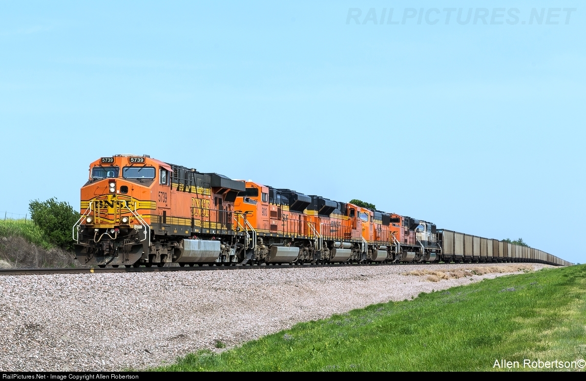 | BNSF 5739 leads a westbound empty coal train down grade west of Litchfield, Nebraska. I assume the trailing units are a power move as they are not running and there is a DPU on the rear. |