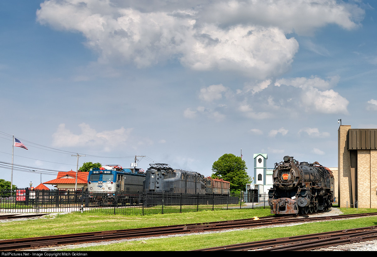 From left to right: Amtrak's AEM-7 No. 915 built in 1981, retired 2015. PRR GG1 No. 4800, built in 1934, retired 1979. And to the far right, PRR No. 3750, built in 1920, retired in 1957. To the far left is the station at the neighboring Strasburg Rail Road while the white and green structure between the GG1 and No. 3750 is the entrance to the RRMofPA.