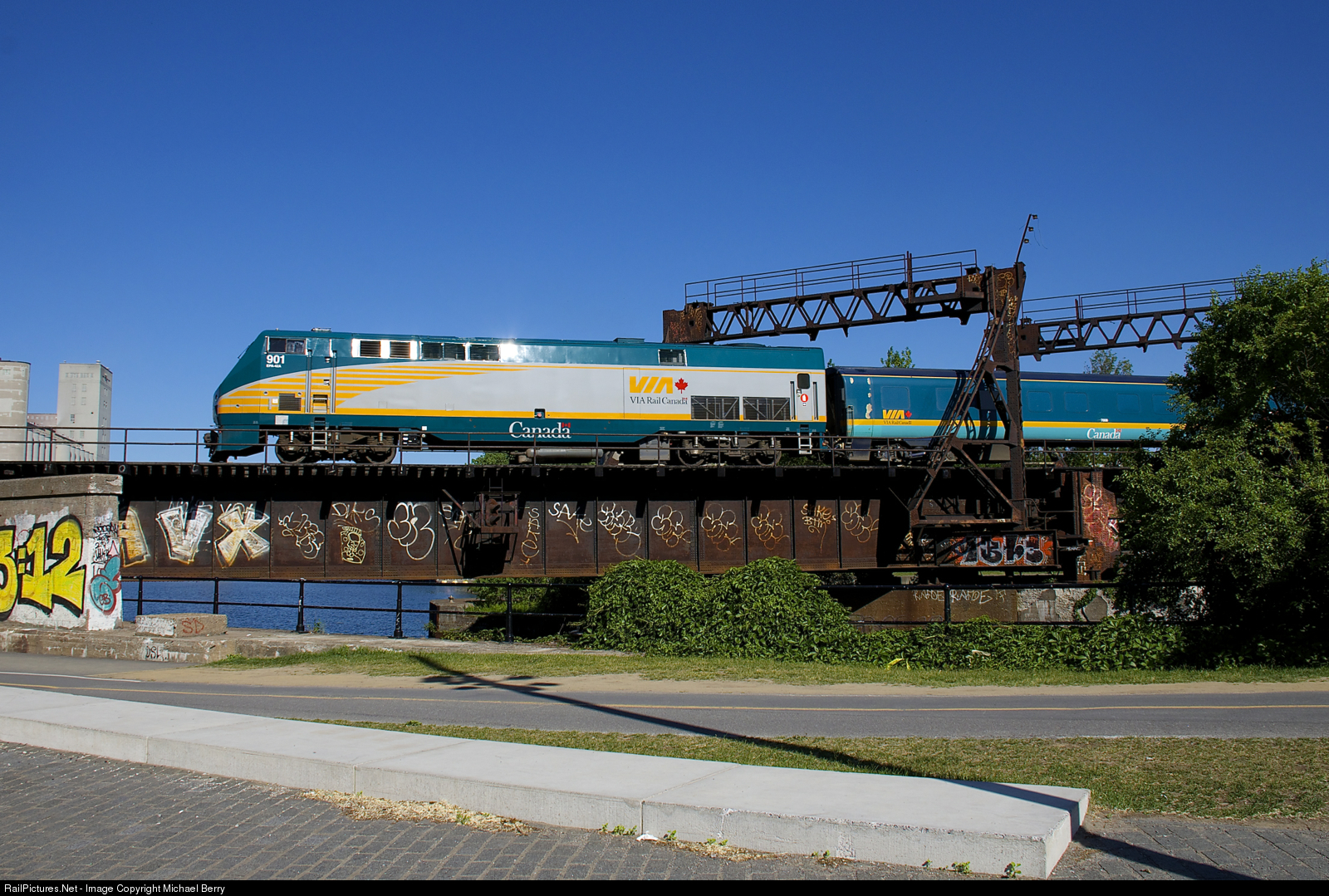 | Back from the dead. VIA 901 caught fire on March 2nd 2014 while on VIA 57 near Alexandria, Ontario and was subsequently out of service for the next four years. It was finally put back into service this past winter and is looking good as it pushes VIA 37 over the Lachine Canal in Montreal. |