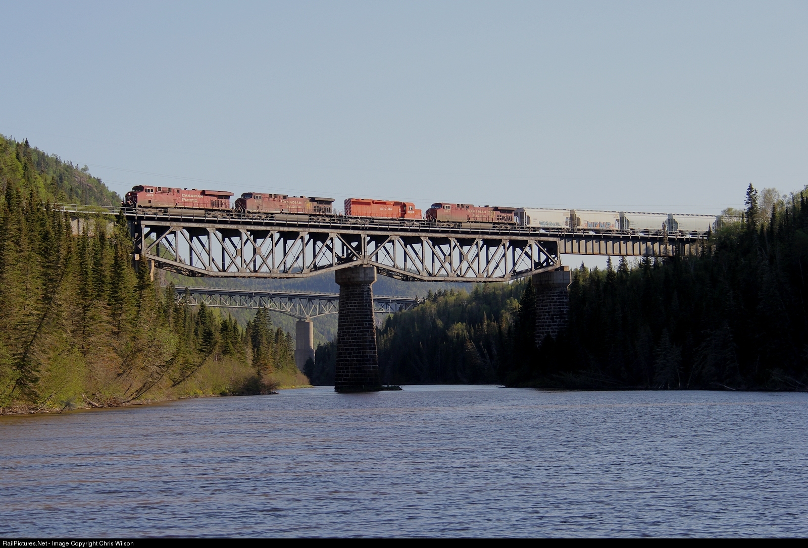 CP ES44AC 8879, AC4400CW 9716, SD40-2 5946, AC4400CW 8526 are on the helm of Montreal to Edmonton train #119 as they cross the Little Pic River. CP ES44AC 8726 is assisting mid train.