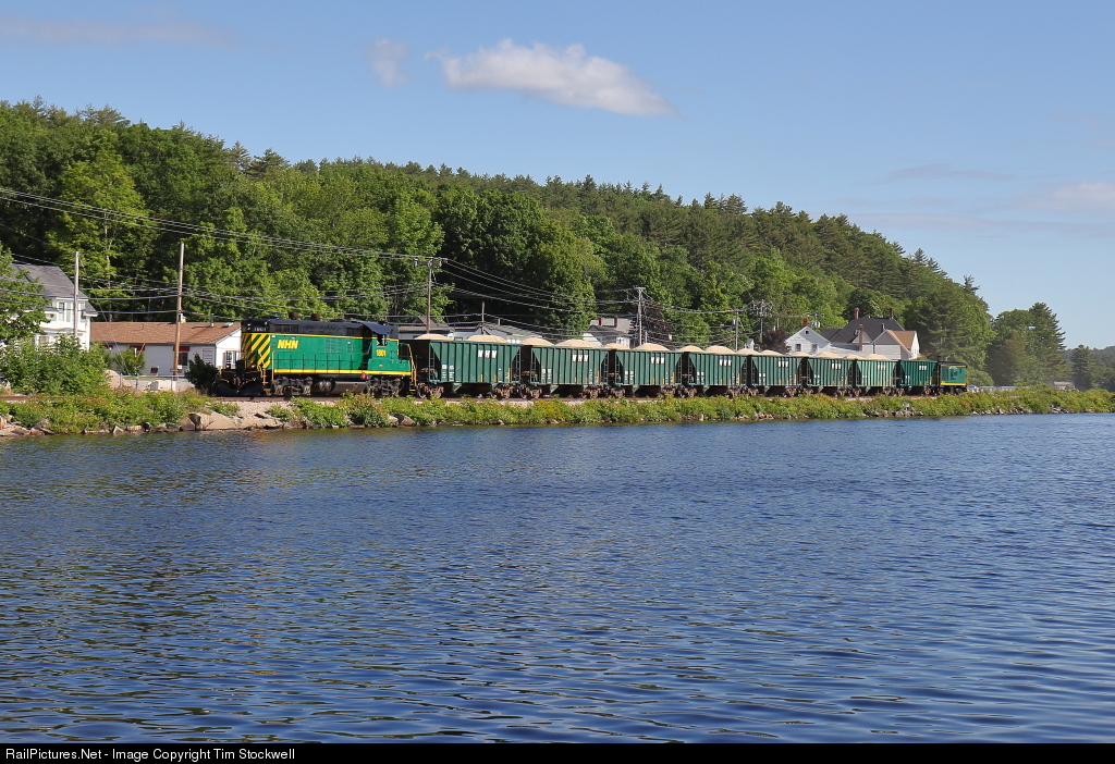 On early Monday morning, the New Hampshire Northcoast ran an extra south out of Ossipee complete with NHN GP18 #1801 and caboose to pick up state officials in Somersworth for a northbound tour up the line. For the trip down, the train brought seven loads of sand for Tri-City in Rochester, plus one empty. As viewed from just across the border in Maine, here the southbound train cruises along Milton Pond in Milton, NH.