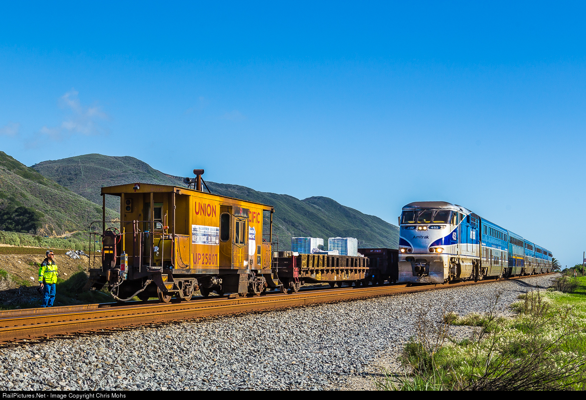 | Union Pacific CA 11 Caboose, No. 25807, brings up the markers on a work train. A crewman is on the ground for the meet with westbound Surfliner No.769 |