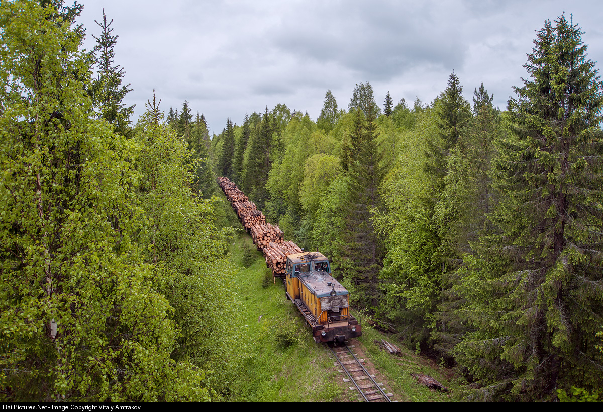 The TU6A-3478 narrow-gauge diesel locomotive is leading a freight train loaded with wood