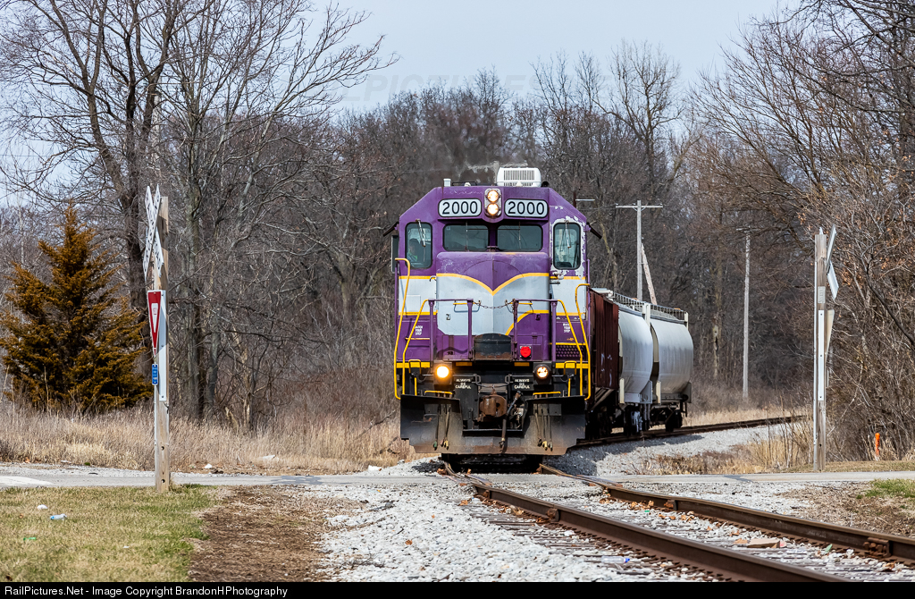 | DOTX 2000 leads the Coldwater - Montpelier turn as they run south through Angola Indiana with a rather short train in tow. This unit has always interested me due to its unique paint scheme with a very clear ACL flavor. Also of interest is the crossing with no lights which scatter this former Wabash line. |