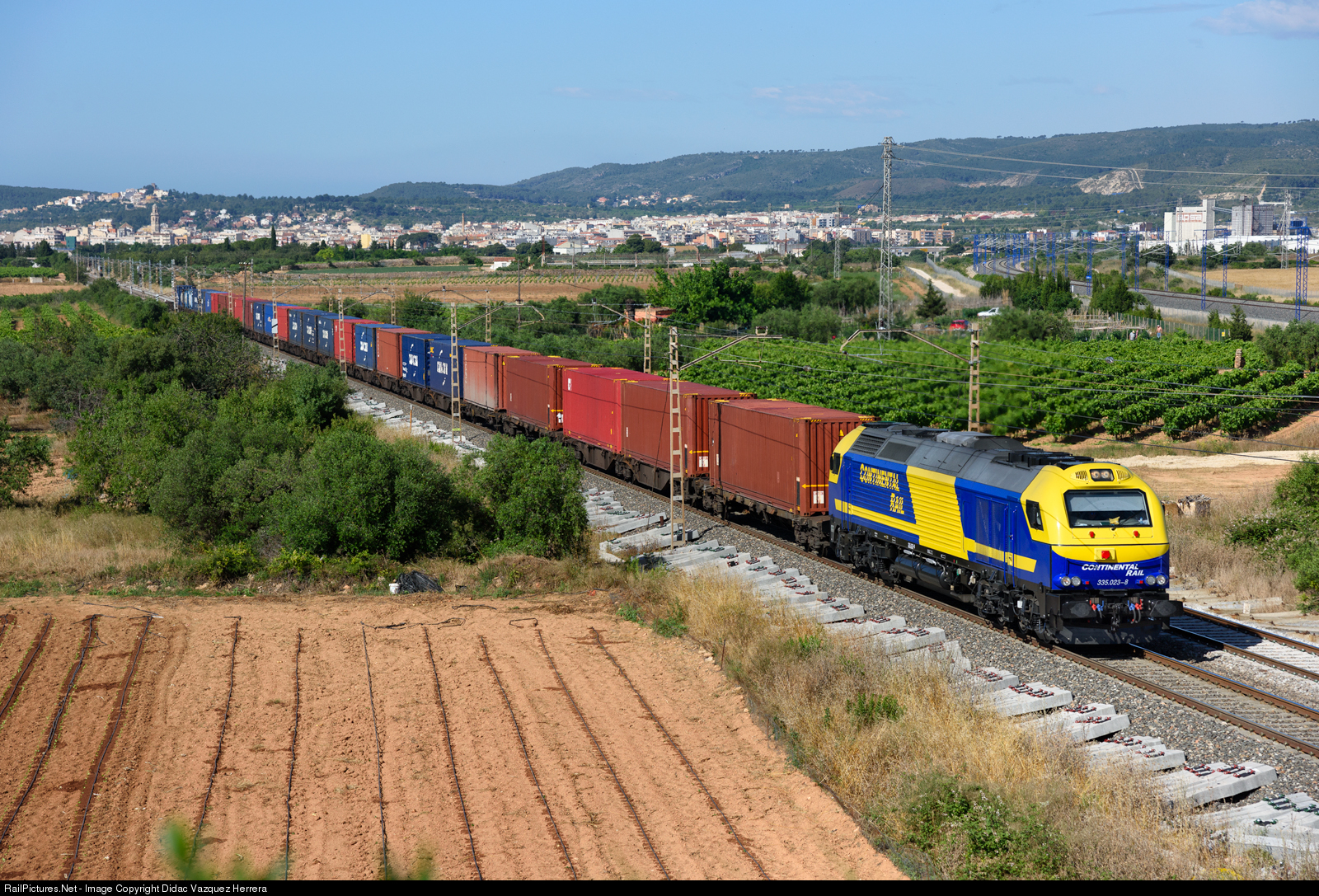 | Container TECO train from Bilbao to Barcelona near Bellvei with recently painted locomotive 335.023 of Continental Rail. |