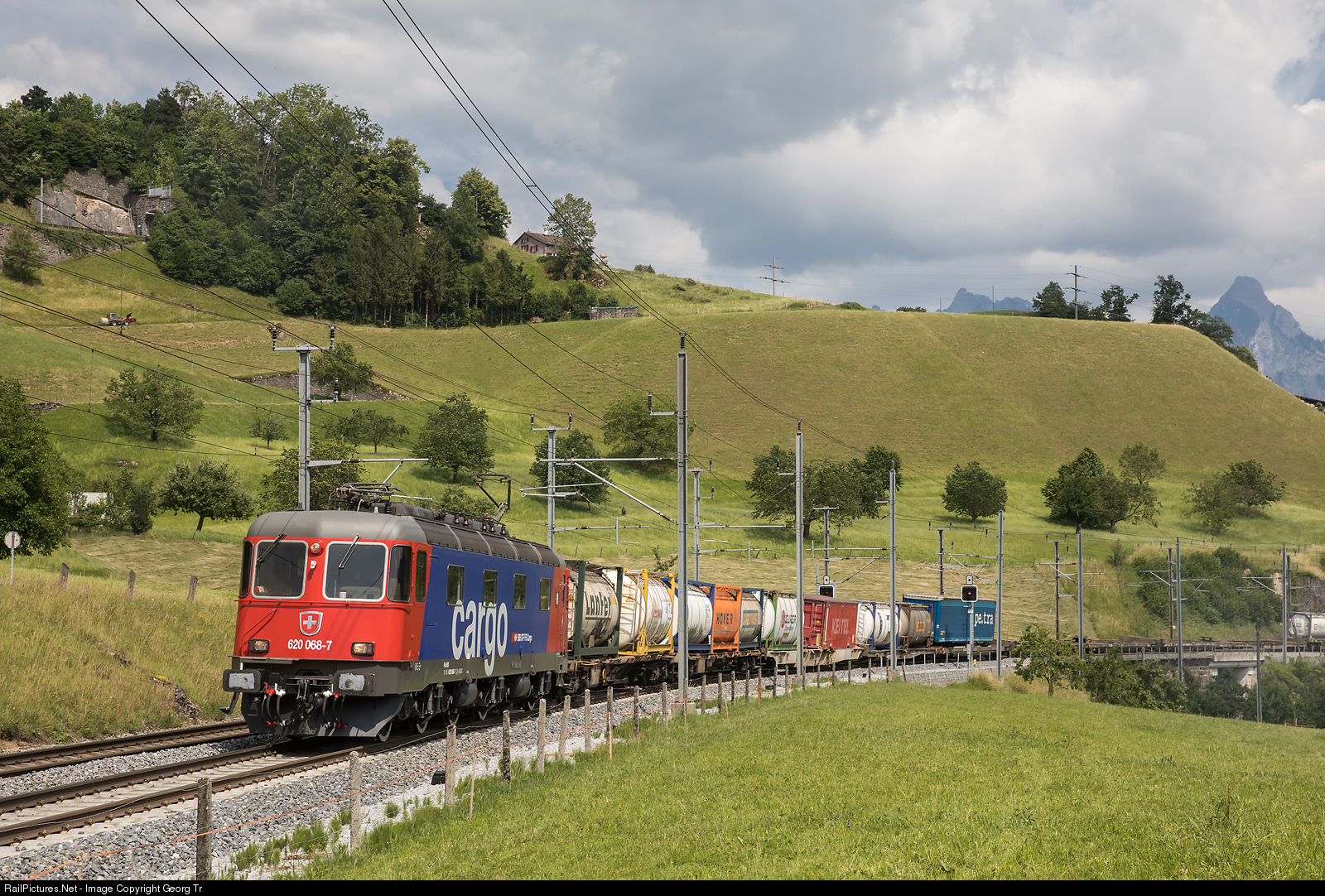 Fresh from revision (Be R3 13.06.2018) and new in the SBB Cargo red/blue paint scheme, the Re 620 # 068 "Stein-Säckingen" is pulling freight 60510 from Bellinzona San Paolo to Basel SBB shunting yard between Steinen and Arth Goldau.