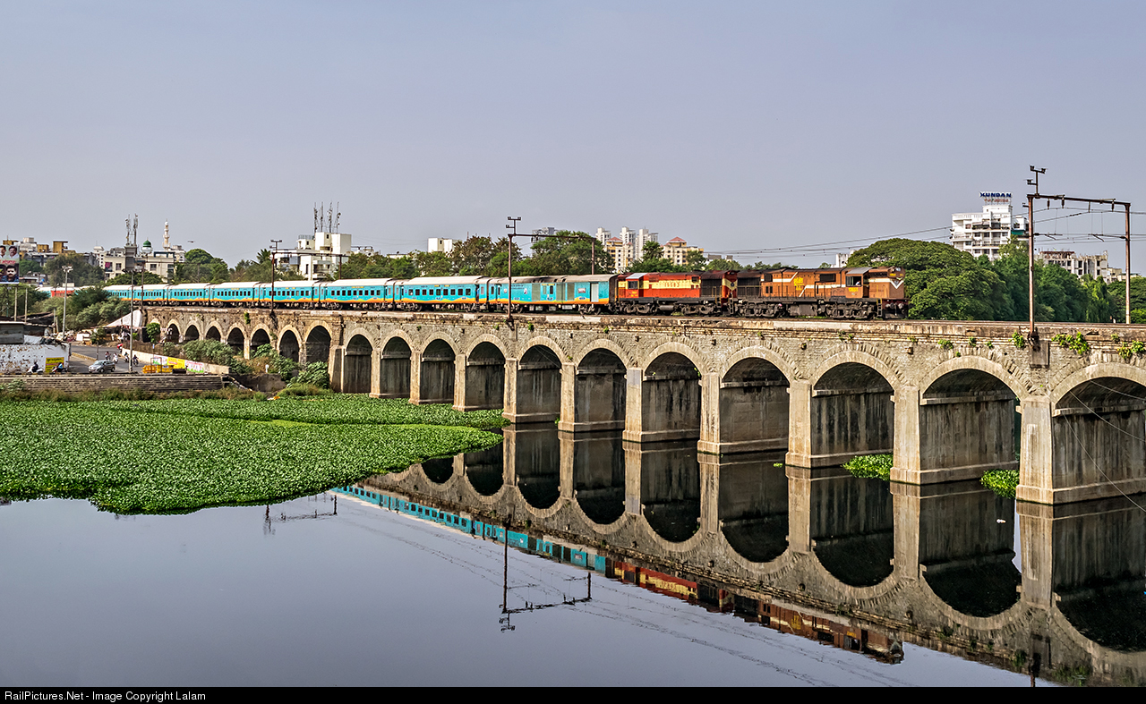 | With twin diesel locomotives from Kazipet shed, Mysore to Udaipur , Palace Queen Humsafar express crosses over Dapodi viaduct in Pune. |