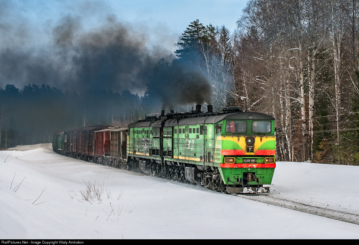 The diesel locomotive 2TE10V-5083 is leading a freight train