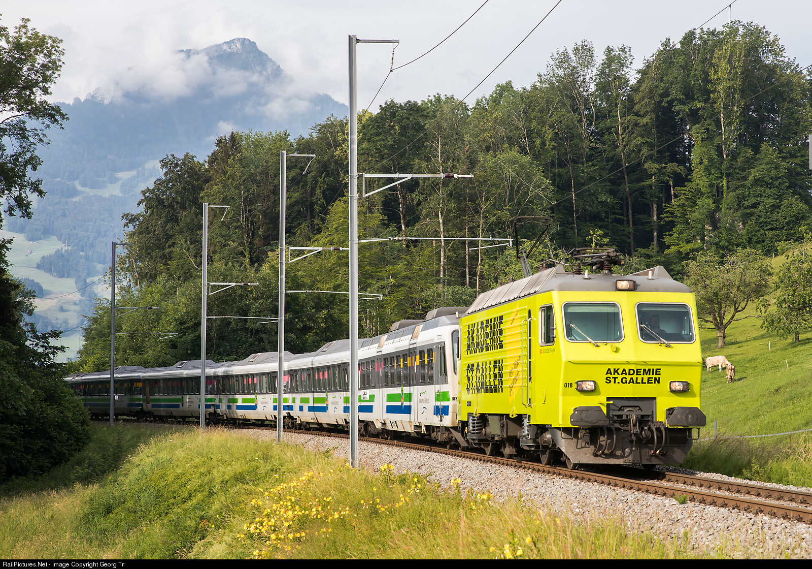 | Re 446 # 018 of the SOB, with publicity paint scheme for "Akademie St.Gallen", is pulling Voralpenexpress 2567 from Lucerne to St.Gallen, between Steinerberg and Sattel-Aegeri. The locomotive was built in 1982 as Re 4/4 IV # 10104 for the SBB and came to the SOB in 1995. |