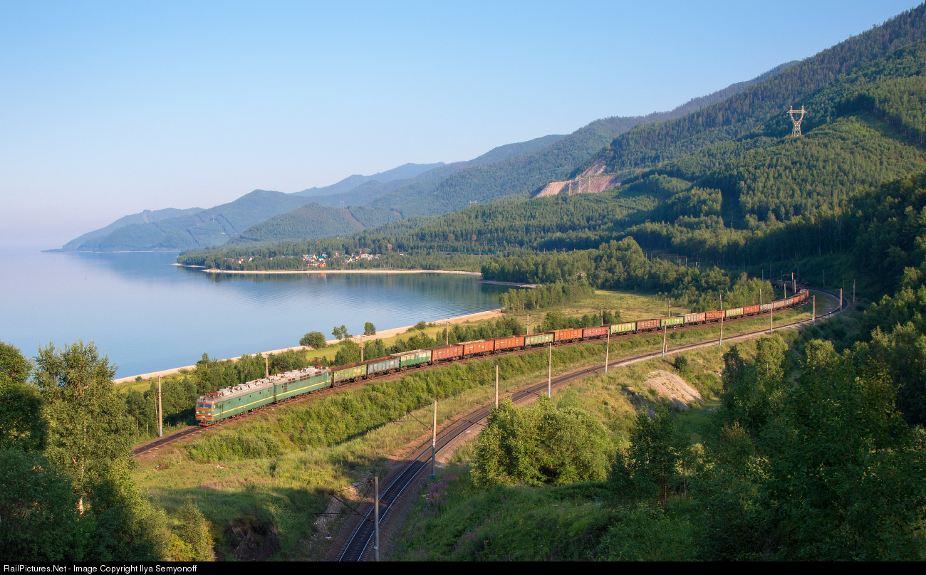 VL85 electric AC freight locomotive goes along the Lake Baikal - the largest (by volume) freshwater lake in the world, containing roughly 20% of the world's unfrozen surface fresh water. At 1,642 m (5,387 ft), Baikal is the world's deepest lake. It is considered among the world's clearest lakes and is considered the world's oldest lake — at 25 million years. Part of the Trans-Siberian Railway runs along the lake Baykal.