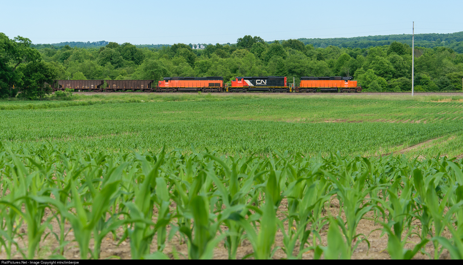 With both BLE 867 and 905 on the train, a Bessemer & Lake Erie (CN) loaded iron ore train heads south past fields of young corn plants in rural western Pennsylvania.