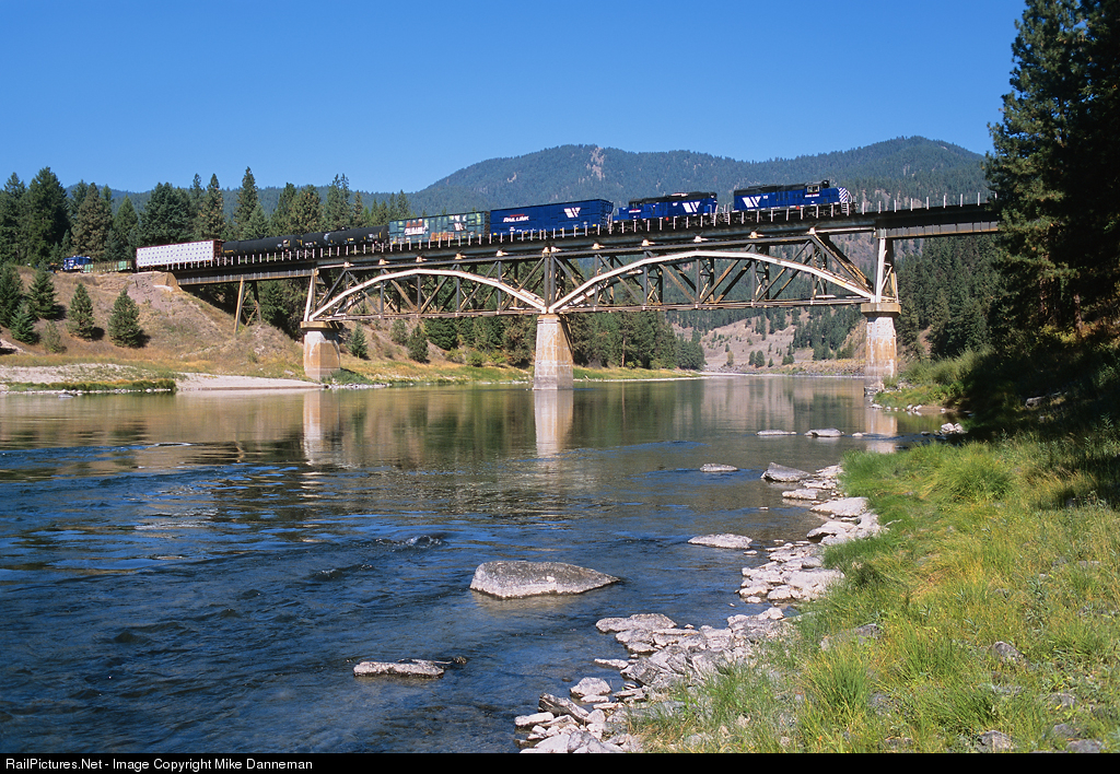 Montana Rail Link’s Paradise local trundles over Bridge 208 west of Donlan, Montana, on September 23, 2009. Normally, the local flies through here after finishing up switching at Tricon Timber in St. Regis, but today it has a “restricted speed” crane bringing up the rear. This bridge was one of five spans crossing the Clark Fork built when the cutoff between St. Regis and Paradise was constructed in 1909. In 1989, MRL determined that it needed upgrading to support modern tonnage ratings, and instead of replacing it, superimposed arches were added in place in the existing structure. The MRL bridge gang also added a new concrete ballast deck and completed the job on October 3, 1990.