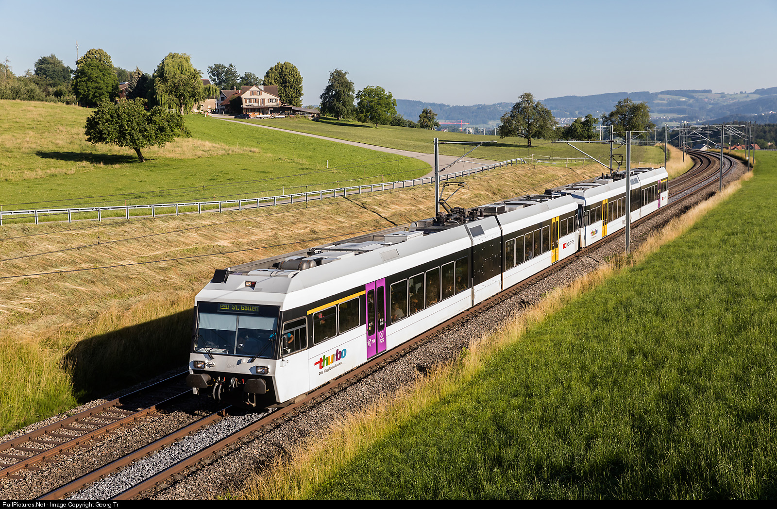 | Articulated lowfloor trains RABe 526 # 686 and # 684 of Thurbo are running the S 11 service 24113 from Wil (SG) to St.Gallen, between Uzwil and Flawil. This are the first generation "Gelenktriebwagen", delivered to the Mittel-Thurgau-Bahn (MThB) in 1998 and now 20 years in service. |
