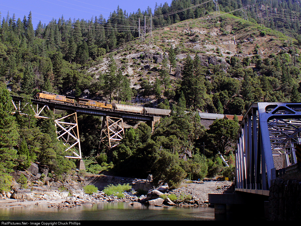 UP freight crosses over Rock Creek trestle heading west.