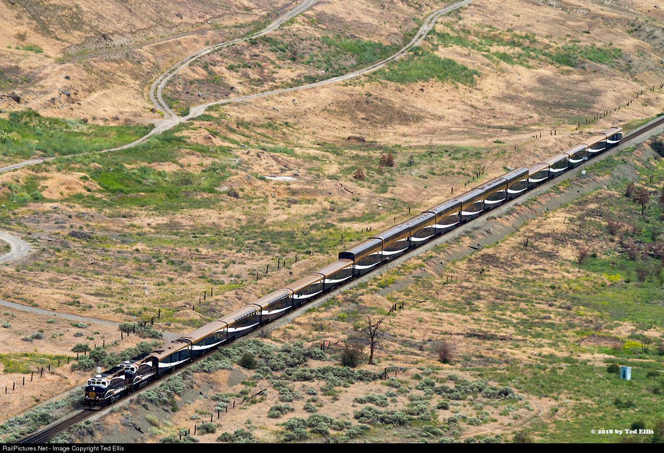 The Rocky Mountaineer Railtour train is highballing west from Ashcroft.