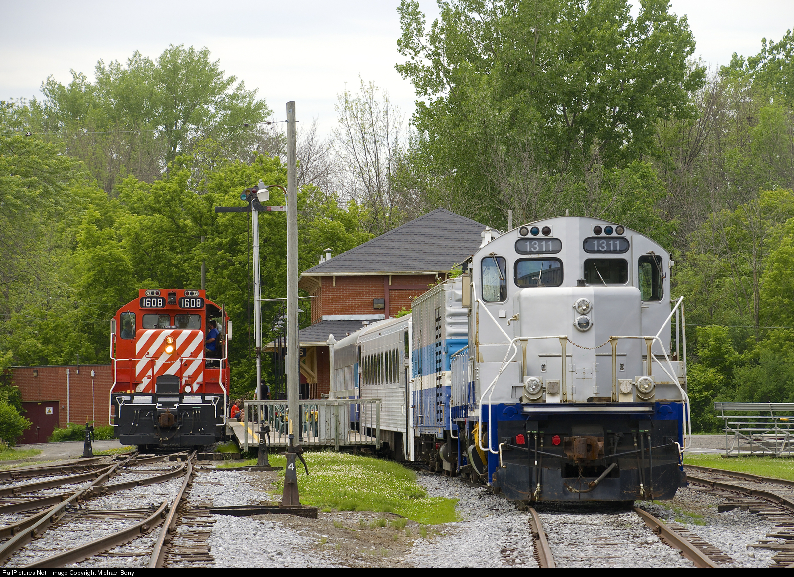 | GP9's in passenger service. GP9 AMT 1311 is parked at right with ex-AMT equipment behind it, at left another GP9 (CP 1608) is waiting to leave Hays Station with an excursion train to Des Bouleaux Station and back. |
