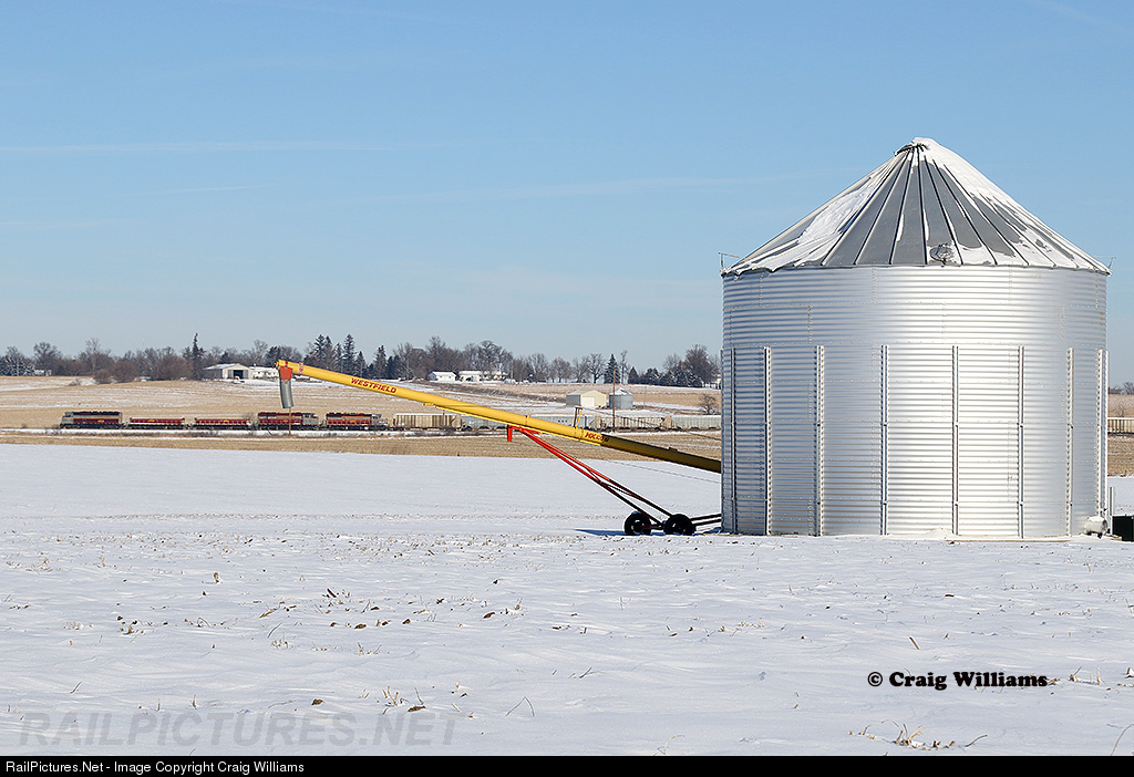 | One thing about Midwest winter's is things get screwed up and late. As is the case today as Caleb and I braved the cold weather to chase the South Crew back towards Waterloo. This is normally an overnight operation, but extremely cold weather has the train late and running 10 mph for the whole trip out of Cedar Rapids. Here the job slowly pokes along between Shellsburg and Vinton. |